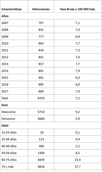 Variables estudiadas: años de fallecido, sexo: (masculino, femenino), grupos de edad: 15-24 años; 25-39, 40-49, 50-59, 60-74 y 75 y más años.