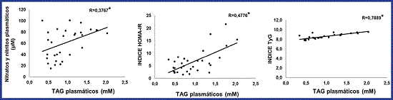 Por otro lado, los niveles de triacilgliceroles se relacionaron proporcionalmente con los índices HOMA-IR y TyG y la concentración de nitratos y nitritos plasmáticos. (Figura 2)