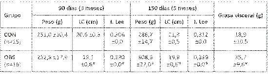 A los 90 días de vida, las ratas controles y las tratadas con GMS presentaron pesos similares. Sin embargo, a los 150 días el peso de las ratas obesas con GMS sobrepasaba significativamente al de los controles. Las ratas obesas mostraron una reducción de su longitud corporal con respecto al grupo control. El índice de Lee y la grasa abdominal se incrementaron significativamente en las ratas tratadas con GMS en relación con los controles. (Tabla 1)