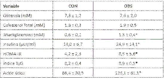 Variables metabólicas: La glucosa, los triacilgliceroles (TAG), el colesterol total y el ácido úrico (juegos diagnósticos HELFAS, La Habana, Cuba) fueron medidos enzimáticamente. La concentración plasmática de insulina fue estimada por radioinmunoensayo.10 La resistencia a la insulina fue determinada mediante el modelo homeostático de Mathews (HOMA-IR) (insulina en ayunas µUI/ml_x glucosa en ayunas mmol/l)/22,5)11,12 y mediante el índice triacilgliceroles-glucosa (TyG): Ln [triacilgliceroles en ayunas (mg/dL) x glucosa en ayunas (mg/dL)/2].13