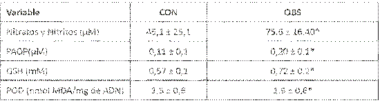 Los animales obesos presentaron mayor concentración de nitratos y nitritos, así como mayores niveles de PAOP y POD. La concentración de glutatión reducido (GSH) no mostró diferencias entre ambos grupos. (Tabla 3)