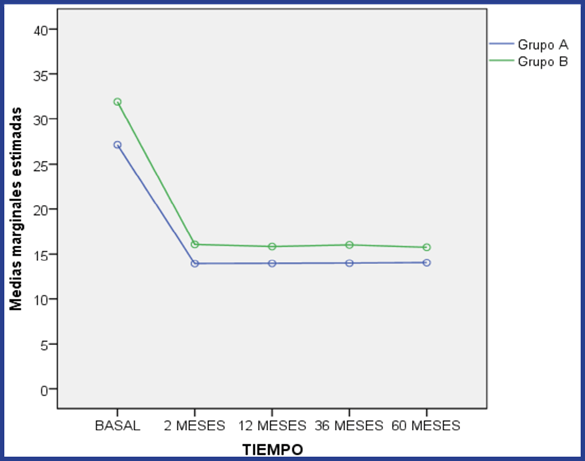Para poder precisar entre que tiempos ocurrieron dichos cambios se procedió a comparar la PIO por parejas ajustadas mediante corrección de Bonferroni para los distintos momentos del factor tiempo. Se comprobó que únicamente existieron diferencias significativas entre el inicio (PIO basal) y el resto de los momentos en ambos grupos; se evidenció estabilidad entre los diferentes tiempos posoperatorios, aunque se constató que las diferencias fueron significativas entre los dos grupos en cada uno de los momentos evaluados. Los valores medios fueron inferiores siempre en el grupo con presión intraocular preoperatoria menor que 30 mm Hg. (Figura 1).