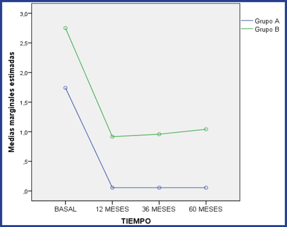 Se comprobó que existieron diferencias muy significativas (p<0,001) en cuanto al número de colirios hipotensores oculares en los diferentes momentos para ambos grupos (tabla 2) y que los cambios obedecieron a las diferencias entre el preoperatorio y los tiempos posoperatorios. Entre los momentos posteriores a la cirugía no existió variación en los dos grupos, aunque el número de colirios posoperatorios necesarios en el grupo A fue inferior a los requeridos en los ojos del grupo B. (Figura 2).