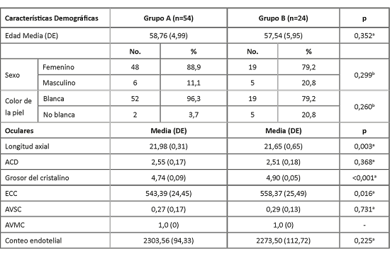 Referente a las variables oculares se evidenciaron diferencias significativas entre ambos grupos para la longitud axial (p=0,003), grosor del cristalino (p<0,001) y espesor corneal central (p=0,016). Los pacientes del grupo B mostraron un ojo más pequeño, un mayor grosor del cristalino y de espesor corneal central en comparación con el grupo A. (Tabla 1).
