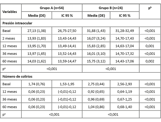 Resultados: hubo diferencias significativas entre ambos grupos para longitud axial (p=0,003), grosor del cristalino (p<0,001) y espesor corneal central (p=0,016). La presión intraocular y número de colirios, variaron de forma muy significativa (p<0,001) entre el pre y posoperatorio, y entre ambos grupos en los diferentes momentos analizados. En el grupo A el 94,4 % de los ojos mostró control absoluto posoperatorio invariable en el tiempo, en el grupo B la mayoría de los ojos tuvo control relativo con diferencias muy significativas (p<0,001) entre ambos.