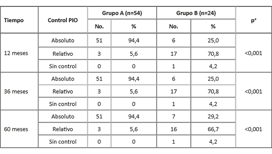 Al analizar control de la PIO, dentro de cada grupo se constató un comportamiento similar en el tiempo. En el grupo A, el 94,4 % de los ojos mostró un control absoluto posoperatorio, que fue invariable en el tiempo; a los 12 meses, 36 meses y 60 meses. En el grupo B, la mayoría de los ojos tuvo un control relativo que también fue estable en el tiempo. Entre ambos grupos hubo diferencias muy significativas (p<0,001) según control absoluto o no de la PIO, en los tres momentos analizados. (Tabla 3).