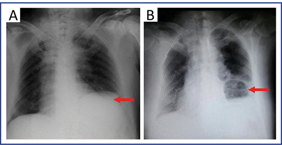 Estudios imagenológicos: Radiografía de tórax: Se observa una elevación del hemidiafragma izquierdo. (Figura 1A).