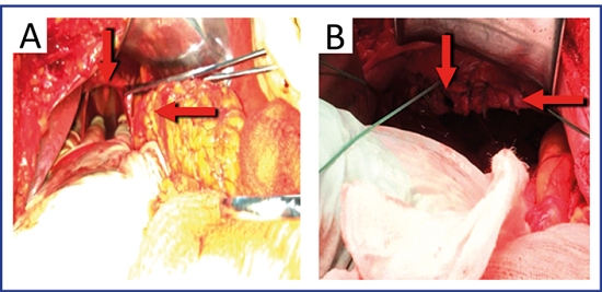 Sospechamos posible hernia diafragmática e indicamos colocar sonda nasogástrica para estudio imagenológico contrastado. Se corrobora el diagnóstico, observándose la sonda nasogástrica en estómago con contraste dentro del tórax. Se decide conducta quirúrgica de urgencia. Se encontró ruptura de 10 cm del diafragma (Figura 2A) con la presencia del estómago dentro de la cavidad torácica. Se retira el estómago del tórax, se realiza reparación y rafia diafragmática sin complicaciones. (Figura 2B).