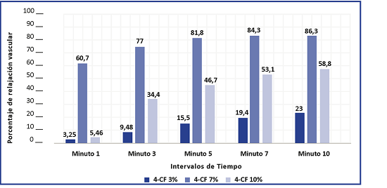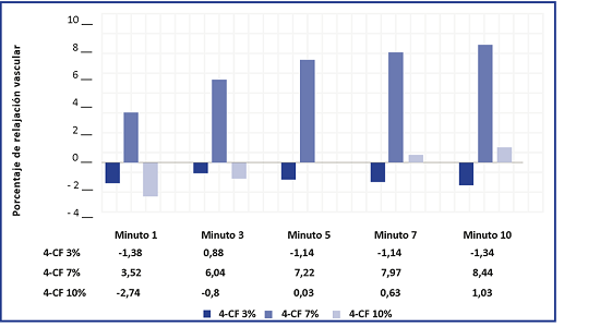 Se destacan igualmente, los valores porcentuales de relajación vascular producidos al tercer minuto, los cuales a excepción de concentración del 7 %, se triplicaron y aumentaron unas seis veces con respecto al minuto inicial, para concentraciones del 3 y 10 % respectivamente.