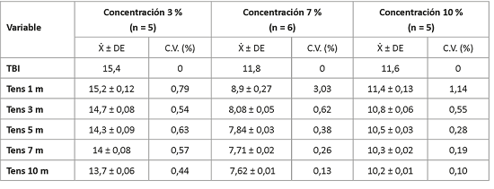 La Tabla 1 muestra las variaciones experimentadas por la tensión muscular tras la preactivación con vasopresina y la adición de p-clorofenol. Como se observa, la fuerza muscular disminuyó con cada una de las soluciones empleadas del fármaco. La mayor variación con respecto a la TBI, se registró a concentración del 7 %, con una disminución de 4,18 mN/g a los diez minutos de adicionado el derivado clorofenólico.