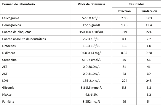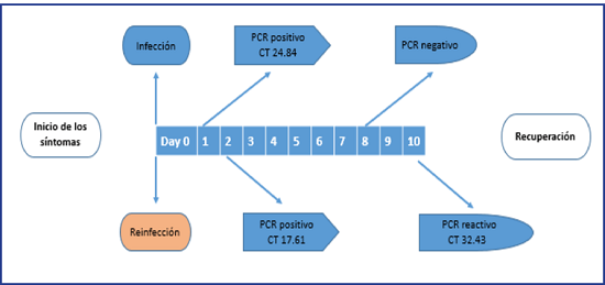 Pasados 9 meses y 9 días de la infección original, y 2 días posteriores a recibir la vacuna BNT162b2 (Pfizer-BioNTech), comienza con malestar general, tos seca, secreción nasal y dolor de garganta. Es atendida al cuarto día del inicio de los síntomas y se confirma reinfección con PCR positivo y CT de 17.61. Se observaron similares hallazgos en las pruebas complementarias realizadas en la infección inicial excepto que se observa leucopenia en la reinfección. Se le impone tratamiento con amoxicillín con ácido clavulánico, azitromicín, hidroxicloroquina y lopinavir/ritonavir. La evolución clínica fue satisfactoria; se presentaron náuseas, vómitos y diarreas de carácter leve y temporal. Después de 10 días del test inicial, el PCR realizado muestra CT en 32.43.