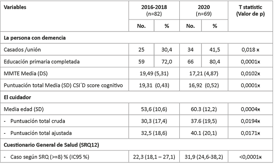 En la tabla 1 se presentan las variables estudiadas en relación con las personas con demencia, así como las características socio demográficas, el grado de sobrecarga y otras variables relacionadas con el cuidado según el período de estudio. En las personas con demencia, evaluados en el periodo 2016-2018 y los re-entrevistados en el 2020 no existieron diferencias significativas en relación con la edad, el sexo y el estadio de la enfermedad. Sin embargo, existieron diferencias en relación con el nivel educacional y el grado de deterioro cognitivo entre aquellos que fueron entrevistados, en ambos periodos. Las personas evaluadas con demencia durante la pandemia, en una mayor proporción habían concluido nivel educacional primario y presentaban mayor deterioro cognitivo según la puntuación en el MMTE y CSI´D.