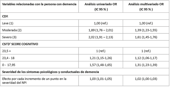 La morbilidad psicológica del cuidador mostró una fuerte asociación con la sobrecarga del cuidador, OR 2,82 (IC 95 % 1,65-3,98) y ajustado 2,01 (IC 95 % 1,04-3,17. Como era de esperar, mayores necesidades de cuidado se asociaron a mayor sobrecarga en los cuidadores y más de seis horas dedicadas a la asistencia de la persona con demencia en la supervisión de las actividades de la vida diaria (AVD), duplicó el grado de sobrecarga en los cuidadores, asociación cruda O.R 2,34 (IC 95 % 1,17-3,50) y O.R ajustado 2,27 (IC 95 % 1,07-3,46).