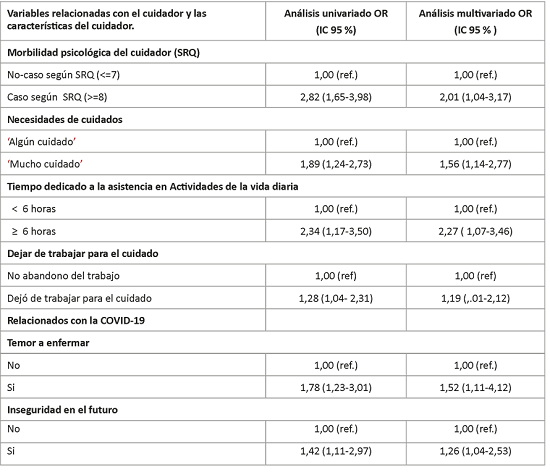 Un indicador indirecto de la situación socioeconómica, el número de medios en el hogar, no se asoció con la sobrecarga, en los cuidadores. Sin embargo, aquellos cuidadores que interrumpieron su trabajo para cuidar a su familiar en el hogar durante la contingencia epidemiológica, sufrieron mayores niveles de sobrecarga, OR 1,28 (IC 95 % 1,04- 2,31) para la asociación cruda y OR ajustado de 1,19 (IC 95 % 1,01-2,12).