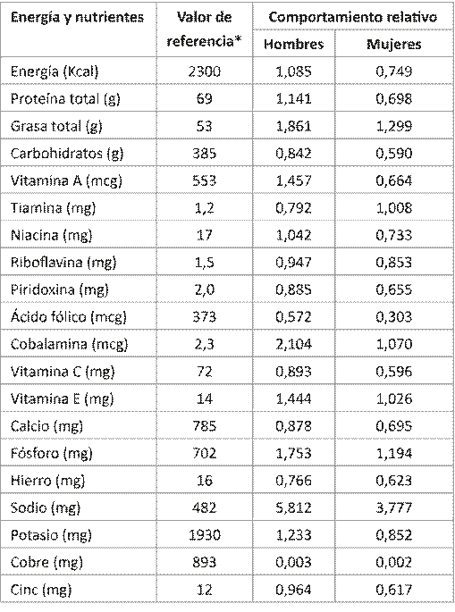 En relación con la ingesta estimada de energía, macronutrientes, vitaminas, minerales y elementos traza, se obtuvo un incremento significativo en la ingesta de proteínas, carbohidratos, hierro, sodio y cinc, y un incremento altamente significativo en la ingesta de cobalamina, en los pacientes de sexo masculino en comparación con las pacientes encuestadas. Con la única excepción para la tiamina, la ingesta de energía y de los restantes nutrientes específicos fue mayor en pacientes de sexo masculino, si bien no alcanzaron significación estadística en las comparaciones con pacientes de sexo femenino. (Tabla 3).