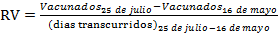 Se consideró RV como un valor constante, siendo la pendiente de la curva de personas totalmente vacunadas en el tiempo entre el 16 de mayo y el 25 de julio de este año 2021. El cálculo del RV se realizó según la ecuación: