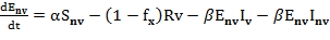 es un parámetro asociado al grado de exposición de las personas susceptibles y RV es el régimen de vacunación (cantidad de personas que se vacunan diariamente), que está dividido en dos fracciones: (fx) que tiene que ver con la vacunación de los Snv y (1-fx) con la vacunación de los Env.