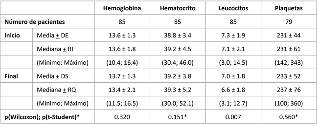 En la Tabla 1 se recogen los valores promedios, medianas y valores máximos y mínimos de los complementarios realizados. Al comparar los valores promedios iniciales y finales para la hemoglobina, el hematocrito y conteo de plaquetas no se encontraron diferencias significativas. En el caso del conteo de leucocitos, este disminuyó de manera significativa después de terminar el tratamiento.