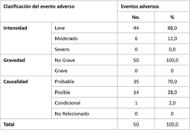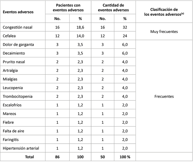 En cuanto a la clasificación de los eventos de acuerdo con la intensidad o severidad (Tabla 4) no se reportaron eventos severos ni graves. Los eventos adversos considerados como moderados fueron: cefalea [2,3 % (2/86)], leucopenia [2,3 % (2/86)], decaimiento [1,2 % (1/86)] e hipertensión arterial [1,2 % (1/86)]. Estos eventos se correspondieron a seis sujetos, de ellos, tres requirieron medicación por vía oral y uno necesitó interrumpir la administración del producto.