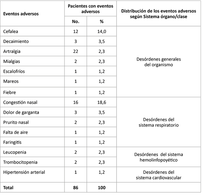 Los eventos adversos clasificados como frecuentes se correspondieron en su mayoría a desórdenes del organismo en general, del sistema respiratorio y del sistema hematopoyético: un resultado esperado de acuerdo con el producto.18,27,32,33
