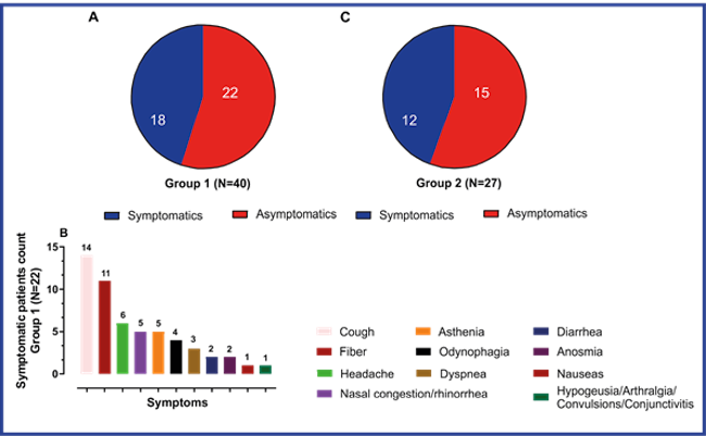 Of the 40 patients included in Group 1, 18 manifested some symptoms related to SARS-CoV-2 infection upon admission and during the hospital stay, and 22 had an asymptomatic infection by the SARS-CoV-2 virus. (Figure 1 A) The most frequent symptoms in this study were the typically expected of a respiratory illness, cough, and fever. (Figure 1 B) However, other symptoms were reported such as nausea, hypogeusia, arthralgia, convulsions, and conjunctivitis, although much less frequently (1 % each).