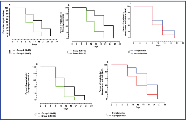 Patients were stratified into symptomatic and asymptomatic and considering p-value is as descriptive, the major difference in time to negativization between groups was observed in symptomatic patients. (Figure 2 B, C) In contrast, within the same group, symptomatic and asymptomatic patients did not show significant differences in time of negativization in Group 1, whereas in Group 2 there were differences. (Figure 2 D, E).