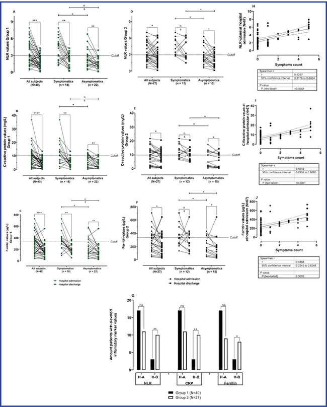 In Group 2 patients, the behavior towards normalization of the NLR values was apparently similar to that of group 1. However, only symptomatic patients significantly reduced the final values vs. the initial ones as opposed to asymptomatic patients. In addition, considering the p-value as descriptive, the significance is lower to that of Group 1. At the time of hospital admission, the mean values of NLR in patients showed significant differences, indicating that asymptomatic patients have lower mean levels. The same behavior was observed at hospital discharge. (Figure 3 D) Similar behavior was obtained for the values of C-reactive protein and Ferritin in this group. (Figure 3 E, F).