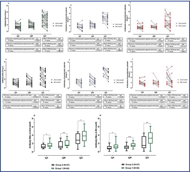 In Group 2, the decrease in antibody values at 4 months was consistent with what was observed in Group 1. Also, the mean values of IgA and IgM were significantly lower at 4 months compared to the results of 2 months of convalescence. Nevertheless, in this case, the IgG mean values were significantly decreased at 4 months. (Figure 4 D, E, F).