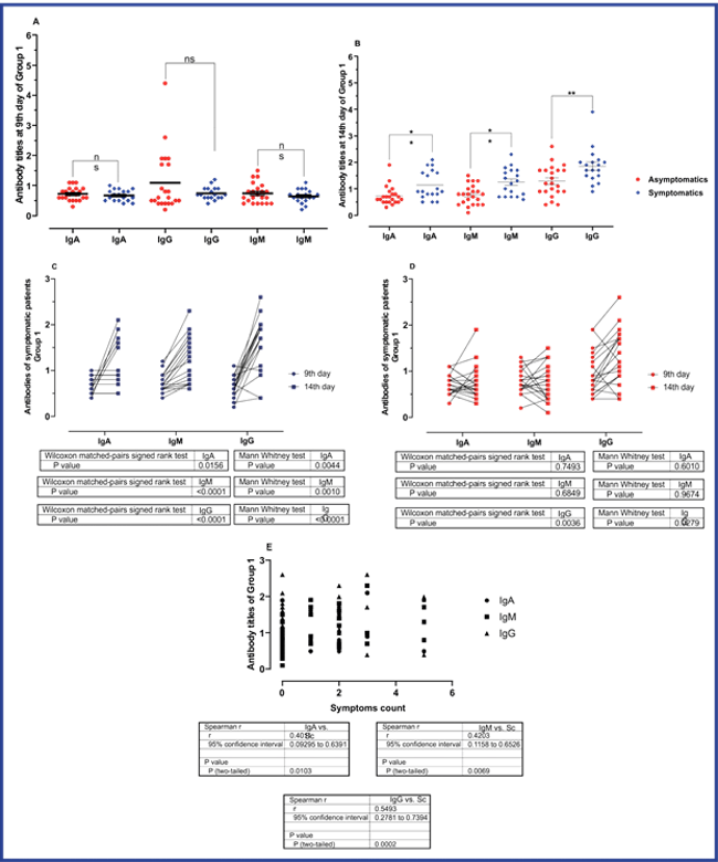 The analysis of paired samples showed a significant increase in IgA, IgM, and IgG levels between the 9th and 14th days in symptomatic patients. (Figure 5 C) However, for asymptomatic patients, a significant increase was only detected for the mean values of IgG titers on the 14th day compared to the 9th day. (Figure 5 D).