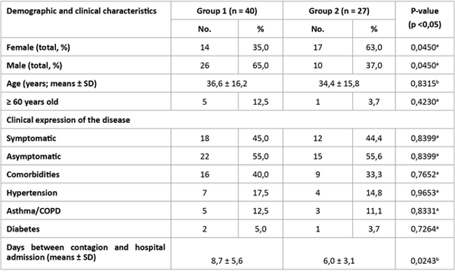 In Group 2, the proportion of female patients (63 %) was significantly higher than in Group 1 (35 %). Instead, the time elapsed between the date of supposed contagion and the date of hospital admission was substantially shorter in Group 2 than in Group 1 (Table 1). Other variables such as age, the clinical expression of the disease, and comorbidities did not show significant differences between both groups (Table 1).
