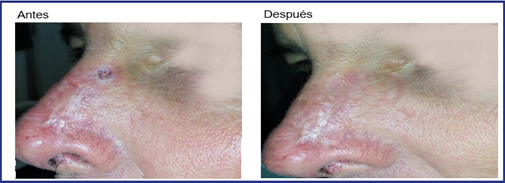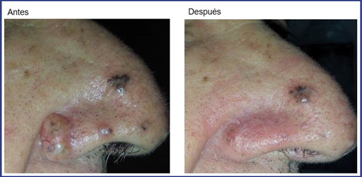 El HeberFERON es una opción terapéutica que disminuye el tamaño del tumor o su eliminación completa por lo que reduce la necesidad de mutilar secciones de piel o deformidades en lugares tan complicados como la región nasal y en el CBC de alto riesgo que son localizaciones especiales que evidencian un mayor índice de recurrencia tumoral y de posibilidad de invasión a estructuras adyacentes y subyacentes como la nariz y surco nasogeniano.12,13