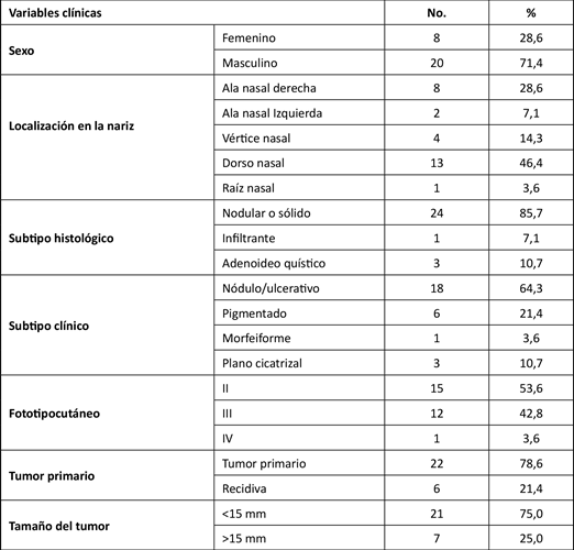Del total de pacientes incluidos, 20 fueron del sexo masculino (71,4 %) predominó el fototipo cutáneo tipo II con 53,6 % y el rango de edad estuvo entre los 42 y 86 años, solo 21,4 % de los casos recibieron tratamiento previo, siendo la cirugía el proceder más frecuente, la localización más común del tumor en la nariz fue el dorso con 46,4 % y el ala nasal derecha con 28,6 %, el subtipo histológico que predominó fue el nodular o sólido con 85,7 % y subtipo clínico el nódulo ulcerativo para 64,3 %. La mayoría de las lesiones fueron menores de 15 mm (75 %). Solo 2 pacientes incluidos no culminaron el esquema de tratamiento por los eventos adversos.