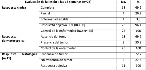 La respuesta al tratamiento se evaluó a través de la clínica, dermatoscopía e histopatología. El 69,2 % pacientes tuvo una respuesta clínica y dermatoscópica completa por no estar presente el tumor (Figuras 1 y 2) y un control de la enfermedad en 100 % de los casos. Desde el punto de vista histológico en 72,7 % no se observó tumor y hubo una respuesta parcial en 27.3 % de los tratados, el resto de los casos se negaron a realizar la biopsia a las 16 semanas durante la evaluación final. (Tabla 2).