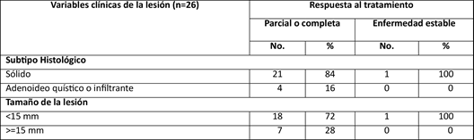 La relación de la respuesta al tratamiento con el subtipo histológico y el tamaño de la lesión se observan en la Tabla 3. Se distingue que en los pacientes con CBC de subtipo histológico sólido 84 % (21 pacientes) tuvo una respuesta completa y parcial, el adenoideo quístico o infiltrante 16 % (4 pacientes). En cuanto al tamaño de la lesión 72 % (18 pacientes) tuvo una respuesta completa y parcial con menos de 15 mm, mayor o igual a 15 mm 28 % (7 pacientes). La enfermedad estable solo fue en 1 paciente con subtipo histológico sólido y menos de 15 mm en cuanto al tamaño del tumor. (Tabla 3).