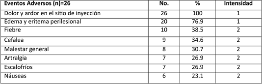 Tipo de evento adverso (fiebre, escalofrío, cefalea, artralgia, mialgia, dolor y ardor en el sitio de inyección, edema y eritema perilesional, náuseas, vómitos, malestar general, taquicardia, bradicardia).