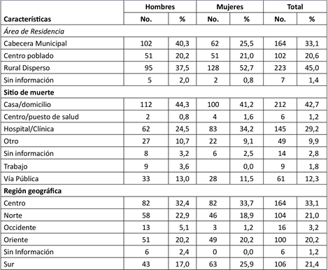 Material and Methods: A descriptive quantitative investigation was carried out. Information was obtained from death certificates processed by the National Administrative Department of Statistics -DANE- of Colombia. Mortality rates were calculated using population estimates and projections made by DANE. Absolute and relative frequency measures were calculated in the variables of person, time, and place that were analyzed.