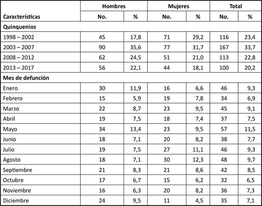 Al revisar el comportamiento del suicidio distribuido por quinquenios, se encontró que el período en que más suicidios se presentaron, fue el comprendido entre 2003-2007, donde ocurrió 33,7 % de los decesos. Al estudiar los meses de ocurrencia, se encontró que el mayor número de casos tuvo lugar en el mes de mayo, con 11,5 %, siendo octubre el mes en que menos casos se presentaron con 6,5 %. (Tabla 2).