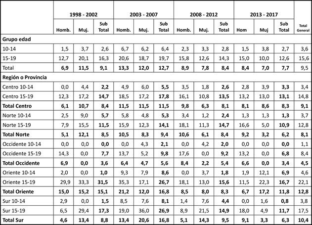 En los 20 años comprendidos entre 1998 y 2017, la tasa de suicidios en adolescentes residentes en Cauca se ubicó en 9,5 por cada 100 000 habitantes (9,4 hombres y 9,5 en mujeres). Según grupos de edades, se halló que la tasa se ubicó en 3,6 por cada 100 000 habitantes en el grupo de 10-14 años, y en 15,6 en los de 15-19 años. Al revisar el comportamiento de las tasas de los grupos de edad según el sexo, se encontró que entre los de 10-14 años, el riesgo de cometer suicidio es 43 % más alto en las mujeres en relación con los hombres (tasa de 4,3 por cada 100 000 en ellas, frente a los 3,0 de los hombres). En el grupo de 15-19 años, se encontró que los comportamientos de las tasas fueron similares: 16,0 por cada 100 000 habitantes masculinos, frente a 15,2 por cada 100 000 habitantes femeninos. Al revisar el comportamiento del suicidio por quinquenios, se encontró que las tasas más altas se registraron entre 2003-2007 con 12,7 suicidios por cada 100 000 habitantes se evidencia también que en ese período se presentaron también las tasas más altas en ambos sexos y grupos etarios; como también que a partir de dicho quinquenio las tasas muestran una tendencia a la disminución. (Tabla 4). Al analizar el comportamiento del suicidio discriminado por regiones geográficas, sobresalió que la región de oriente presentó las tasas más altas con 12,8 por cada 100 000 habitantes, mientras la más baja se encontró en la zona de occidente con tasa de 4,5. Al examinar el comportamiento de las tasas, según grupos de edades y región, la más alta tasa se encontró en el grupo de 15-19 de la región de oriente, con tasa de 22,1 suicidio por cada 100 000 habitantes; la más baja, en cambio, se encontró en el grupo etario de los 10-14 años de la región de occidente, con una tasa de 1,1 por cada 100 000 habitantes. (Tabla 4).