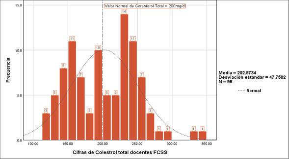 Results: The female sex (79.2 %) and labor duality (57.3 %) prevailed among the professors studied; the average of total cholesterol exceeded the desired limits (202.57 mg/dl), HDL cholesterol prevailed with values lower than normal and the low level of cardiovascular risk prevailed.