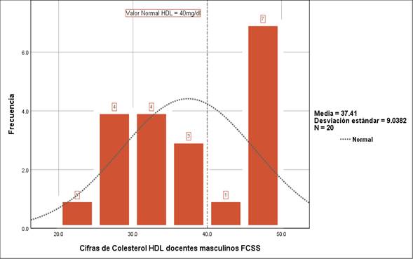 La población masculina examinada alcanzó cifras de colesterol HDL que se exhiben en el Gráfico 3. El valor mínimo para los hombres es de 40 mg/dl, por lo que la media de colesterol HDL representada (37,41 mg/dl), con una desviación estándar de +/- 9,03 mg/dl, revela valores inferiores a los considerados normales, lo que se traduce en un mayor riesgo de padecer enfermedad coronaria.