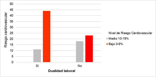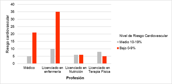Conclusions: It was demonstrated that there is a statistically significant association between the level of cardiovascular risk and the profession of the educators from the Faculty of Health Sciences, Universidad Técnica del Norte, Ibarra. The difference in the number of professors with a low and medium level of cardiovascular risk was greater among those who practice labor duality.