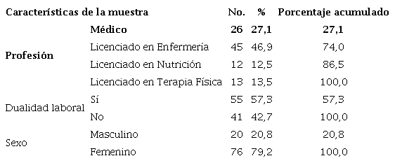 La Tabla 1 refleja el predominio en el sexo femenino con 79,2 % y de los docentes titulados como profesionales de Enfermería con 46,9 %. La dualidad laboral estuvo representada por 57,3 % de la población estudiada; es decir, prevalecieron los docentes que además de la docencia, prestan sus servicios profesionales en hospitales y consultas privadas en las diferentes ramas de la salud.