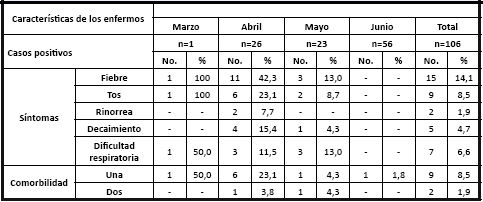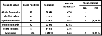 Results: The incidence was 64.6 x 105 inhabitants. The highest rate of 124.1 x 105 inhabitants belonged to the area of Pulido Humaran Polyclinic. The lethality was 1.89 %. The mean age of the patients was 38 years, prevailing in men (55.7 %) and workers (80.2 %). The frequent symptoms were fever, cough and respiratory distress (14.1 %, 8.5 %, 6.6 %, respectively). Comorbidities were reported in 8.5 % of the positive cases. Asymptomatic patients had an influence (81.1 %). The outbreaks of COVID-19 increased the number of patients and occurred in three health areas.