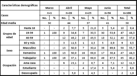 Las características demográficas de los pacientes (Tabla 2), muestra que la edad media fue de 38 años, con un intervalo de 30-44 años. Los enfermos predominaron en los adultos más jóvenes (19 a 39 años) con 44,3 % y en el sexo masculino con 55,7 %. En el período hubo un predominio de casos positivos en trabajadores con 80,2 %, seguidos de las amas de casa con 11,3 %. También, dos desocupados resultaron enfermos.