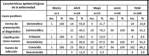 Los casos positivos asintomáticos representaron 81,1 % y se incrementaron después del tercer mes (Tabla 4). Los casos secundarios fueron aumentando y reflejan la trasmisión de la enfermedad a expensas del incremento en ese período. Los casos secundarios del mes de junio responden al estudio de controles de foco de casos positivos de mayo y de otros municipios. Solo en 4 casos (3,8 %) no se detectó la fuente de infección.