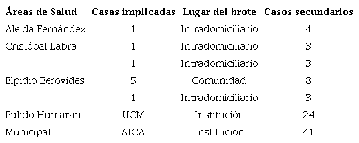 Los brotes de la COVID-19 (Tabla 5), se presentaron en tres áreas de salud, superior en el área del “Elpidio Berovides”, tanto intradomiciliarios y domiciliarios como en instituciones. Todos fueron analizados en los Consejos de Defensa y controlados por las áreas de salud, con la ayuda de la comunidad, las autoridades de salud del municipio, los actores intersectoriales y de la provincia. El control en instituciones contó además con el apoyo ministerial.