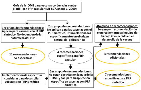 Paso 2. Identificar recomendaciones para producción y control de las vacunas basadas en el PRPc: Las recomendaciones en la guía mencionada en el Paso 1 están redactadas de manera descriptiva, diseminadas a lo largo del documento y algunas se reiteran. Por esta razón, se agruparon en los diferentes temas que tratan y se redactaron en forma de indicación para este trabajo de captación de todos los requerimientos o pautas. Esto permitió organizarlas y visualizar con mayor claridad el estándar internacional para la producción y control de las vacunas con el polisacárido de origen natural.