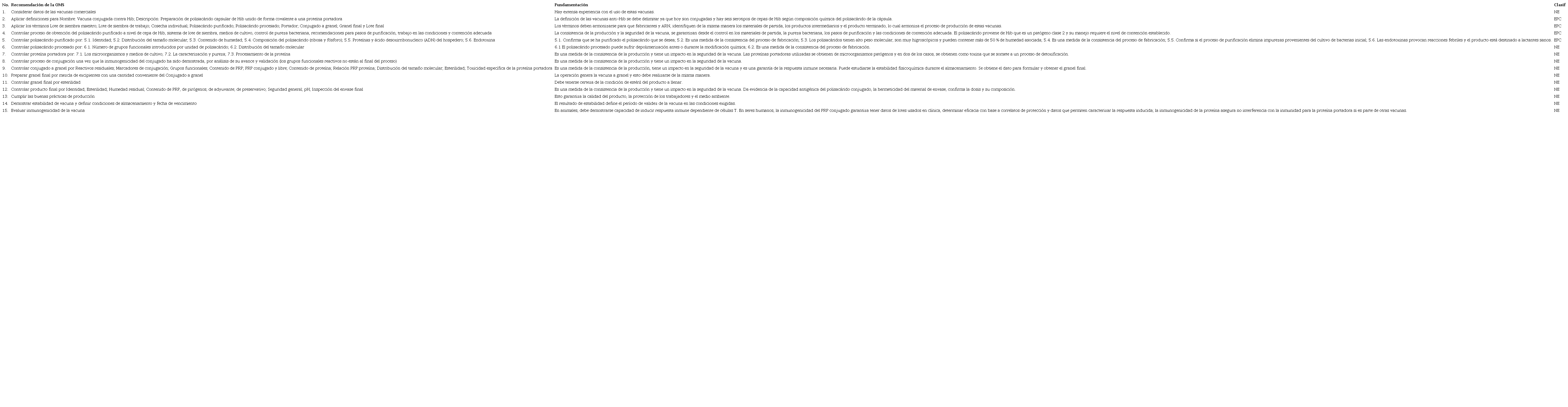 Para la producción y control de vacunas conjugadas contra Hib, basadas en el PRPc, se identificaron 15 recomendaciones de la guía vigente de la OMS para estas vacunas.2 Se relaciona el contenido general de estas 15 recomendaciones, la fundamentación de cada una y su clasificación a partir del consenso en el equipo de trabajo. (Tabla 1).
