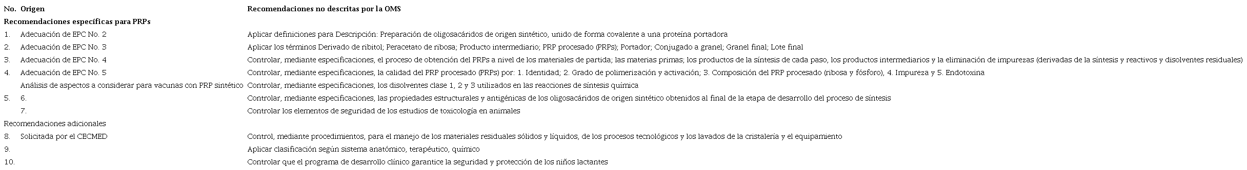 En un análisis global de la estrategia regulatoria, a las 11 recomendaciones de la OMS que nombramos recomendaciones no específicas (Tabla 1), se suman otras 10 que nombramos recomendaciones específicas para PRPs (Tabla 2). El paquete regulador diseñado para Quimi-Hib® en Cuba incluye por tanto 21 requisitos. Estos últimos suman elementos positivos para el desarrollo de la nueva vacuna para y su reconocimiento como vacuna conjugada contra Hib (Tabla 2, filas 1, 2, 9), elementos de trascendencia para la calidad de la misma (Tabla 2, filas 3, 4, 5), elementos relevantes dentro de la caracterización del PRP obtenido (Tabla 2, fila 6), elementos relacionadas con el cuidado del medio ambiente (Tabla 2, fila 8) y a la protección de las poblaciones vulnerables que participan en estudios clínicos (Tabla 2, filas 7, 10).
