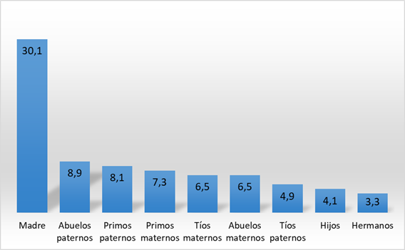 En relación con los antecedentes familiares de la DI, llamó la atención que 80,7 % de los casos estudiados tenían al menos un familiar con la misma discapacidad. Los antecedentes la línea parental materna predominaron con 51,4 % de los casos versus los antecedentes de la línea parental paterna (21,9 %). Si se distribuyen según la proporción de genes en común cuyos familiares comparten con el caso índice o propósitus, en la medida que disminuye la proporción de genes a compartir disminuye la agregación familiar de DI. El 37,5 % de los casos presentan familiares de primer grado afectados, entre los que se destaca la madre con DI (30,1 %), le sigue en orden de frecuencia los familiares de segundo grado (26,8 %), entre los que se destacan los abuelos paternos (8,9 %) y maternos (6,5 %). Por último, los familiares de tercer grado (15,4 %), destacándose los primos maternos (7,3 %) y paternos (8,1 %). (Figura 1).